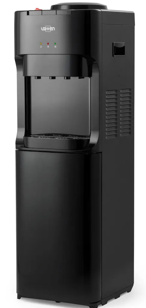 Напольный кулер для воды без шкафчика, без холодильника. Кулер для дома и офиса. Электронное охлаждение (0,6л/ч) + нагрев воды (6л/ч). Цвет черный. Три крана с кнопками. Подходит для домашнего и офисного использования, на предприятиях и учреждениях.