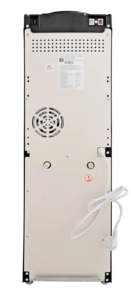 Компактный напольный кулер для воды c электронным охлаждением (плата Пельтье). Без шкафчика. Современный дизайн. Для дома. Для офиса. Бутылеприёмник, верхняя и передняя панель изготовлены из высококачественного, устойчивого к ультрафиолету ABS пластика чёрного цвета, нижняя панель из нержавеющей стали, боковые панели из пластика чёрного цвета. Два крана, управление кнопками - горячая и холодная вода. Кран горячей воды имеет "защиту от детей". Пригоден для эксплуатации в очень жарком климате - температура эксплуатации кулера от 10 до 38 градусов Цельсия.