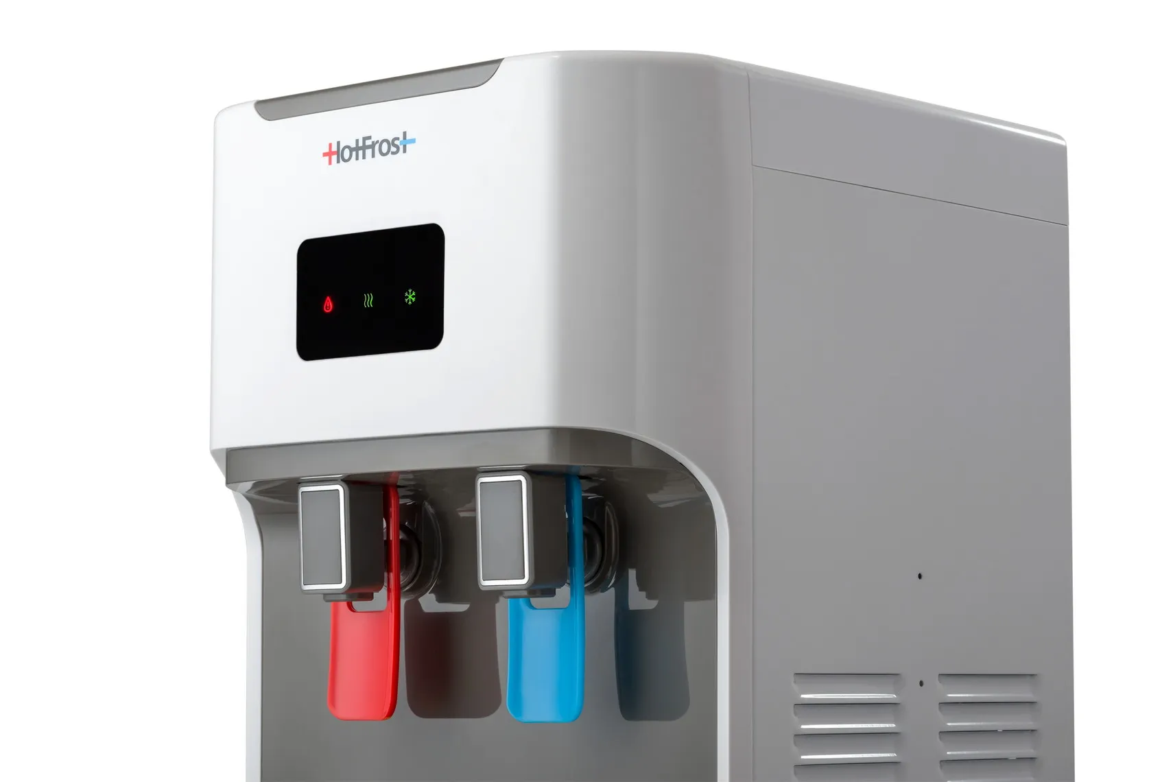 Изюминкой диспенсера являются аккуратные краники типа «нажим кружкой», они очень эргономичны и удобны тем, что для набора воды требуется только одна свободная рука (в которой находится чашка). Такие краны являются наиболее популярными по результатам опроса наших потребителей