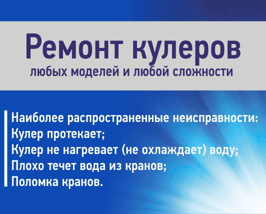 Специалисты компании "Аква" оказывают профессиональные услуги по ремонту кулеров различных производителей и торговых марок. Вам не нужно будет везти кулер к нам самостоятельно – при заказе услуги наши сотрудники заберут оборудование из Вашей квартиры или офиса, а после выполнения ремонта - привезут обратно.